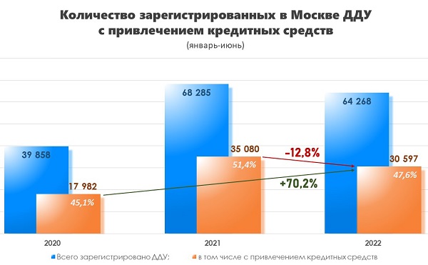 «В июне москвичи зарегистрировали в 1,3 раза больше первичных договоров с использованием кредитных средств по сравнению с маем. Доля кредитов от общего числа регистраций ДДУ составила 56% по результатам месяца, — комментирует Игорь Майданов, руководитель Управления Росреестра по Москве, — Всего же за шесть месяцев этого года Управлением зарегистрировано 30,6 тыс. таких ДДУ – это на 4,5 тыс. договоров меньше, чем годом ранее, а к 2020 году за тот же период прирост составил 70,2%. Таким образом, по итогам первого полугодия почти 48% договоров участия в долевом строительстве были оформлены с привлечением кредитных займов».
