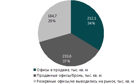 Среди ожидаемых к вводу офисов для продажи на текущий момент около 37% от общего объема уже были реализованы девелоперами, еще около 29% остаются в резерве, либо не были выведены на рынок.