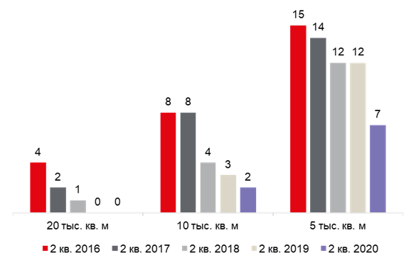 Несмотря на ухудшение экономической ситуации и приостановление проведения части переговоров по аренде и продаже офисных площадей, на офисном рынке по-прежнему остаются активны крупные компании банковского сектора и государственные структуры. Так в июне 2020 года была заключена крупнейшая за всю историю рынка сделка аренды компании «Тинькофф Банк» в БЦ AFI Square, которая составила 30% от общего объема спроса за 2-й квартал. По прошествии 6 месяцев 2020 года суммарный объем сделок с блоками площадью более 5 тыс. кв. м составил 276 тыс. кв. м, что в 2,5 раза превышает показатель прошлого года за аналогичный период.