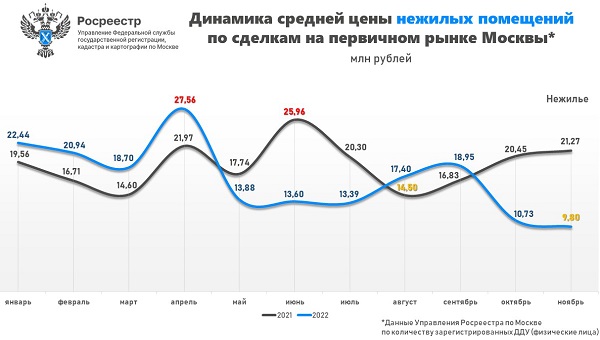 «По результатам одиннадцати месяцев средняя стоимость сделок на первичное жилье снизилась на 7,9% (17,8 млн рублей) к аналогичному периоду прошлого года (19,4 млн рублей), нежилье – подешевело на 10,7% (17,0 млн рублей) с 19,1 млн в январе-ноябре 2021 года, — комментирует Игорь Майданов, руководитель Управления Росреестра по Москве, — И только на машино-места средняя цена по зарегистрированным ДДУ с начала года достигла 2,3 млн рублей, что на 17,2% выше прошлогоднего показателя января-ноября (1,9 млн рублей)».