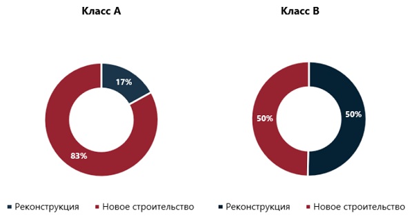 39% действующих офисных площадей класса А и В расположены в объектах реконструкции. Конструктивные ограничения адаптируемых зданий (шаг колонн, высота этажей, несущие стены, мощности лифтов и парковок) часто не позволяют соблюсти полный набор требований класса А, поэтому редевелопмент преимущественно формирует предложение в сегменте В. В итоге среди офисных центров класса A на объекты реконструкции приходится лишь 17% площадей, тогда как в классе B – 50%.