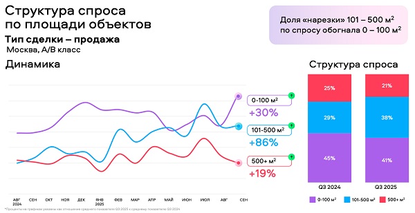По итогам III квартала 2025 года интерес к покупке столичных офисов на «Авито Недвижимости» увеличился на 44% год к году, причем наибольшая динамика отмечается для площадей от 101 до 500 кв. м — они стали востребованнее на 86%.