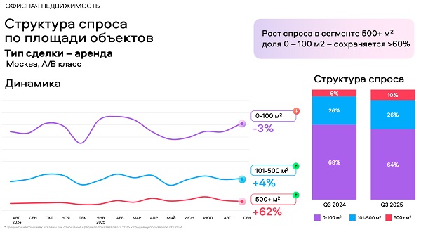 В сегменте аренды офисы до 100 кв. м занимают подавляющую долю в структуре спроса — 64%. В 26% случаев арендаторы интересуются объектам от 101 до 500 кв. м, на большие офисы свыше 500 кв. м приходится 10% спроса. При этом интерес к аренде таких объектов год к году вырос на 62%, в то время как спрос на офисы меньше площади изменился незначительно. В целом, аренда офисов в Москве в III квартале 2025 года оказалась на 3% востребованнее, чем годом ранее.