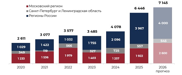 В Санкт-Петербурге и Ленинградской области на начало 2026 года представлено 6,4 млн кв. м качественных складских площадей. Это 11% от общего объема российского рынка (57,8 млн кв. м). Объем ввода складской недвижимости в России к концу 2026 года может достичь рекордных за всю историю наблюдений 7,1 млн кв. м. Ожидается, что на Санкт-Петербург и Ленинградскую область придется 545 тыс. кв. м или 8% от общероссийского показателя.
