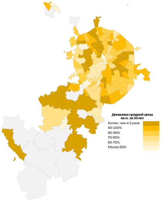 - За 10 лет сильнее подорожали более доступные районы и локации, в которых улучшилась транспортная доступность. Наименьшие темпы роста цен – в престижных локациях центра и юго-запада, которые уже в 2012 г. входили в число самых дорогих.