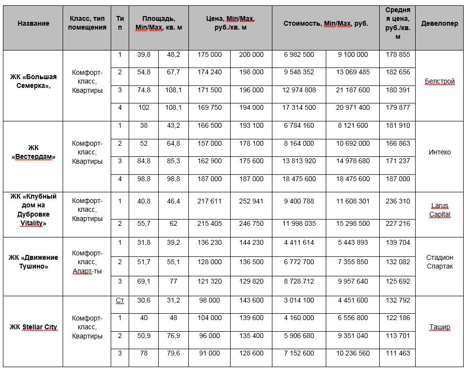 В сегменте комфорт в реализацию вышло 5 новых комплексов – ЖК «Большая Семерка», ЖК «Вестердам», ЖК «Клубный дом на Дубровке Vitality», ЖК «Движение Тушино» и ЖК Stellar City. Цены в данных проектах варьируются от 3 млн рублей до 21,1 млн рублей, при этом студии представлены только в одном из комплексов.