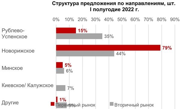 Основной объем предложения элитного загородного жилья сосредоточен на двух направлениях – Новорижском и Рублевском. Лидирующую позицию по объему предложения на вторичном рынке занимает Новорижское направление: здесь предлагается 44% всех коттеджей, таунхаусов и участков. На Рублево-Успенское приходится 35% лотов. На первичном рынке Новорижское направление также занимает лидирующую позицию – 79% предложения, а Рублево-Успенское шоссе располагается на втором месте – 15%.