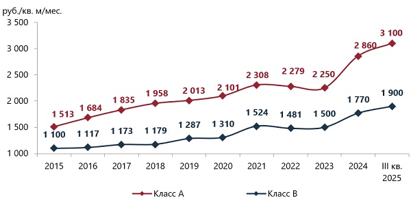Средневзвешенная запрашиваемая ставка аренды офисов класса A в Санкт-Петербурге по итогам III квартала 2025 года составила 3,1 тыс. руб./кв. м в месяц (включая НДС), что на 8,8% выше по сравнению с аналогичным периодом прошлого года. В свою очередь, в сегменте класса B рост более значительный – на 24,2%, до 1,9 тыс. руб./кв. м.